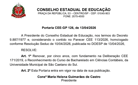 Conforme publicação da Portaria CEE/GP 126/2026, de 13/4/26, a USCS obteve a renovação do reconhecimento do Curso de Ciências Contábeis pelo prazo de 5 anos.